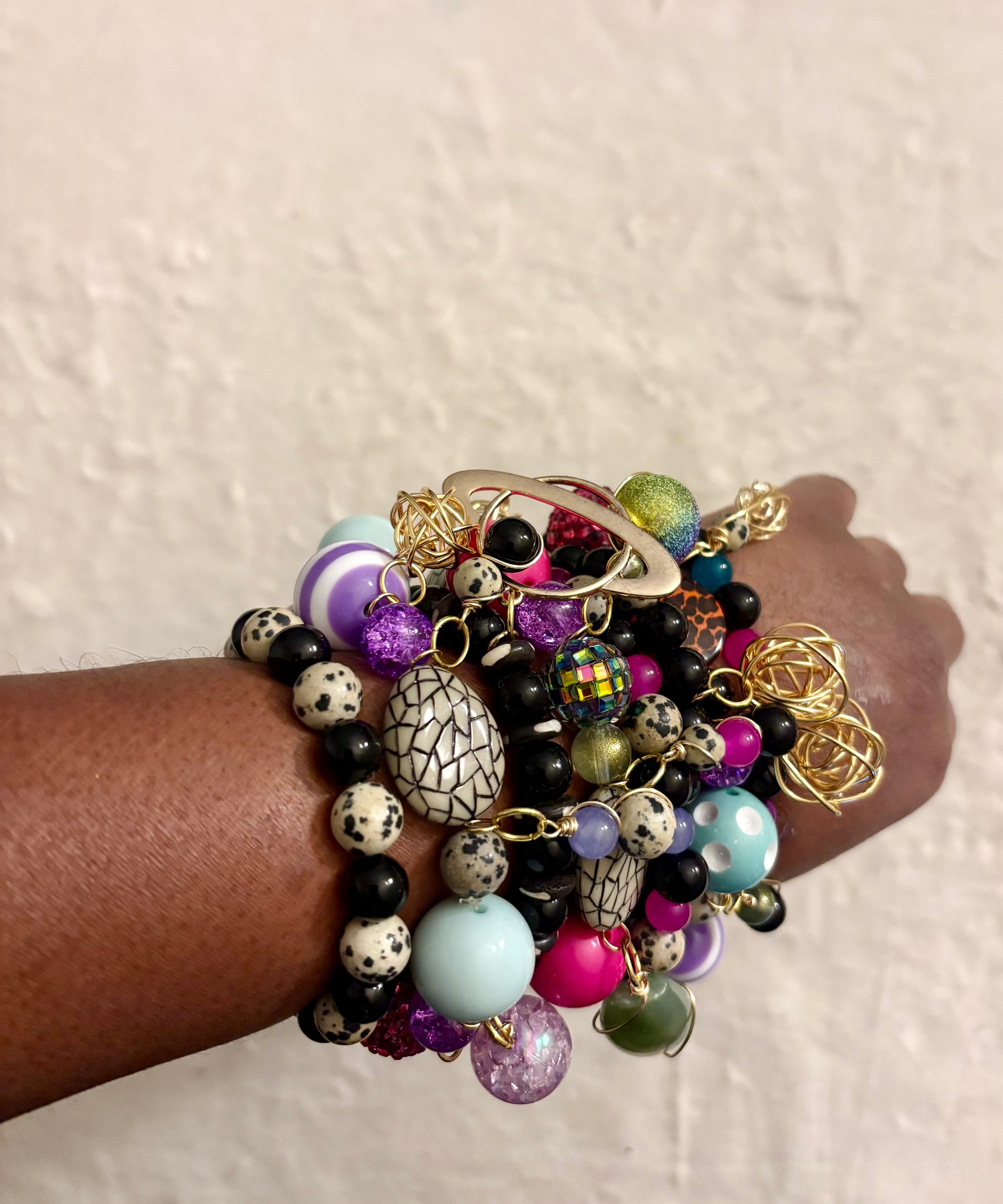 Handmade beaded maximalist charm bracelet stacks for those who appreciate art, creativity and uniqueness. Your jewelry should be just as unique as you. Each bracelet stack is a 1 of 1 designs you can't find anywhere else and handmade one bracelet and charm at a time.