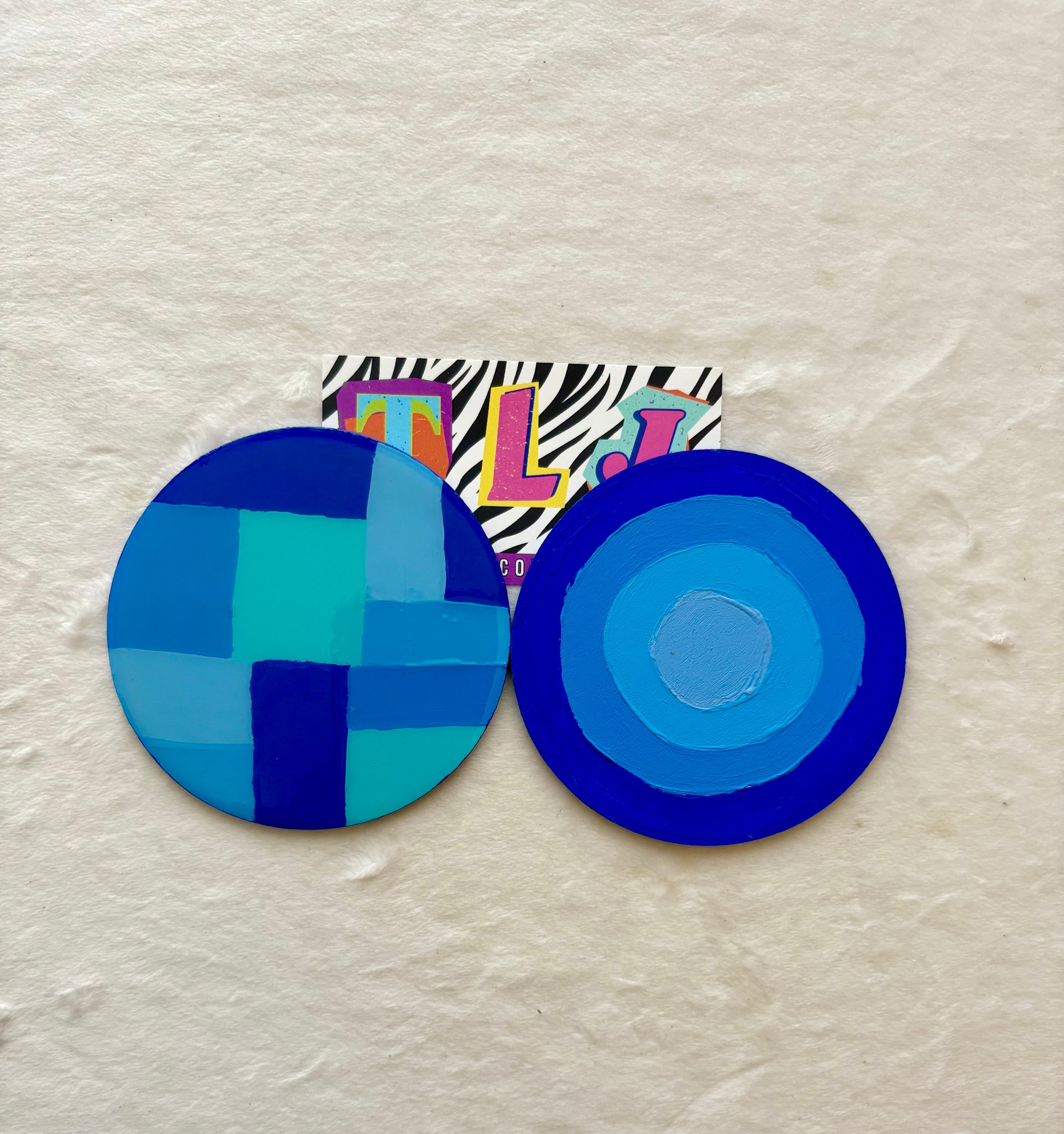 Multi color blue patchwork painted design with an ombré blue circle design painted on the back