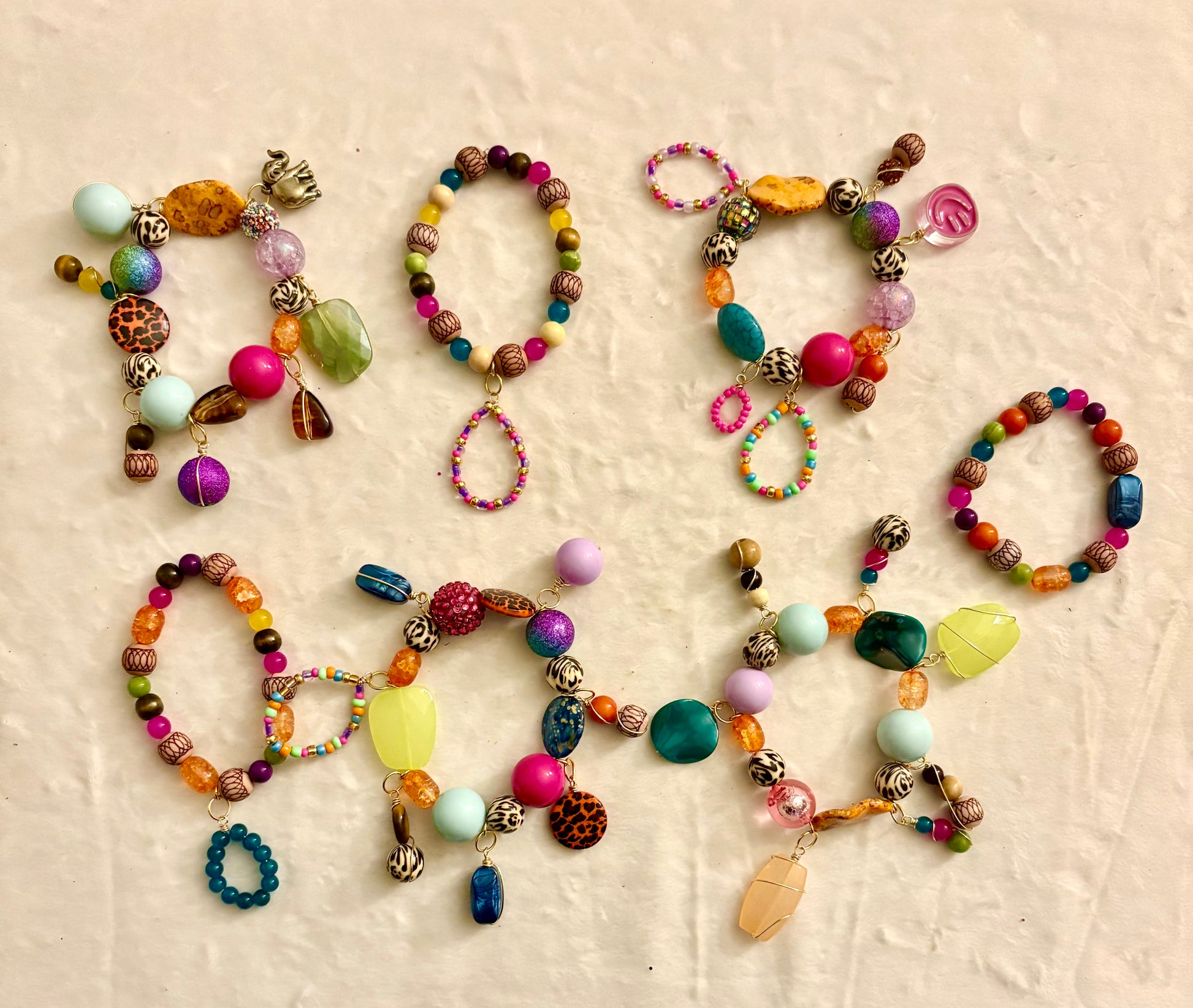 Handmade beaded maximalist charm bracelet stacks for those who appreciate art, creativity and uniqueness. Your jewelry should be just as unique as you. Each bracelet stack is a 1 of 1 designs you can't find anywhere else and handmade one bracelet and charm at a time.
